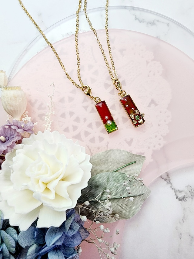 シンボル部分0.5×2㎝、 チェーン50cm、 ゴールドカラーの土台を、赤と緑のレジンで飾りました。 シンプルなパールと、お花を添えた品の2種をご用意しました。