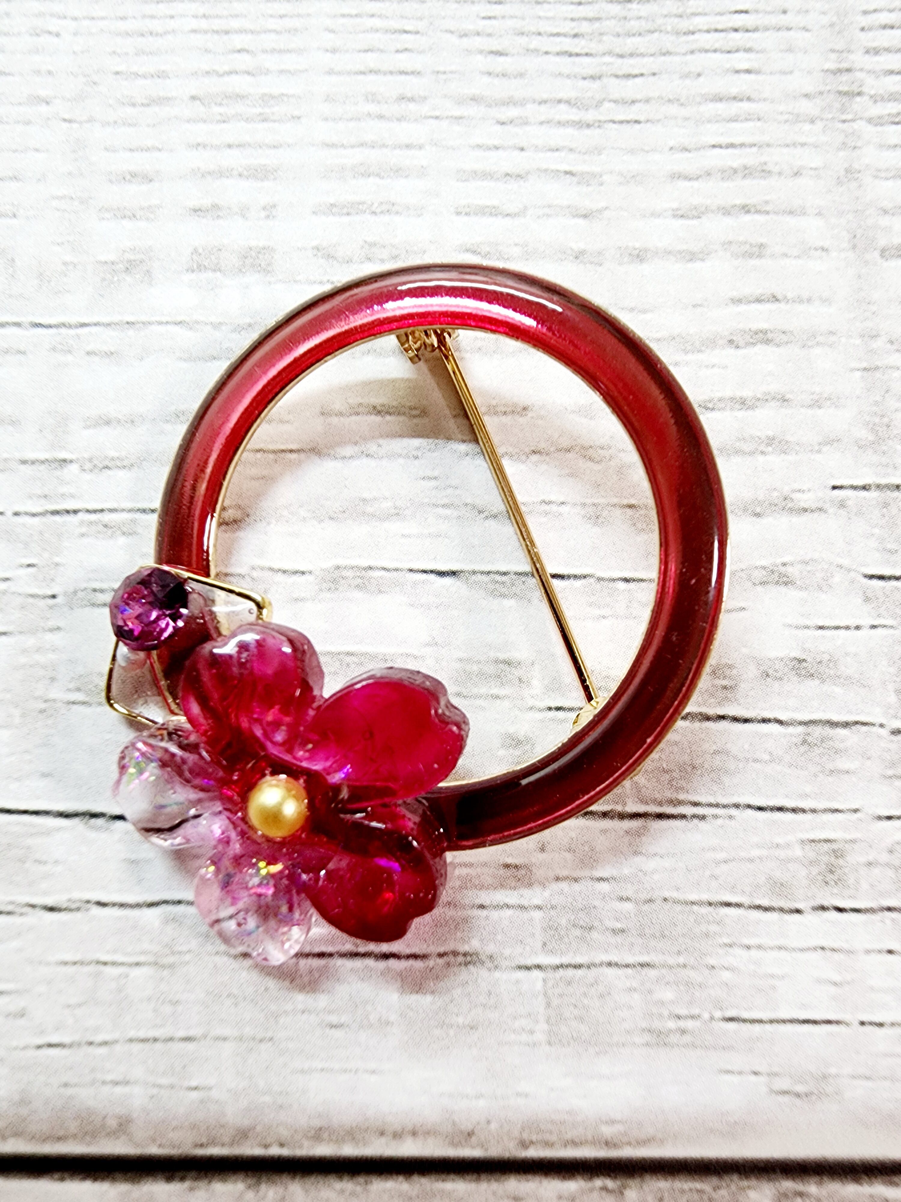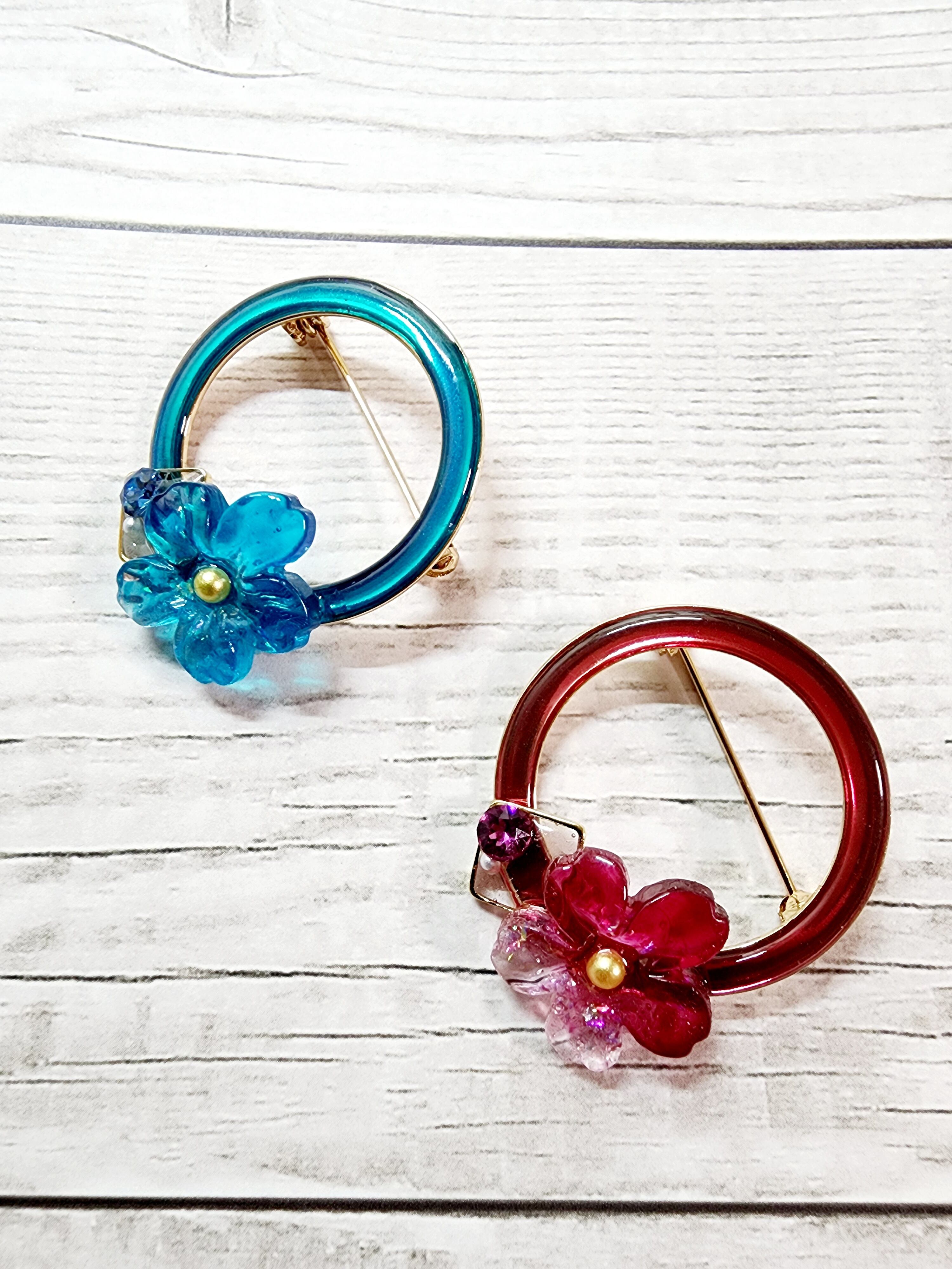 花とビジューを飾ったシンプル可愛い円型のブローチです。