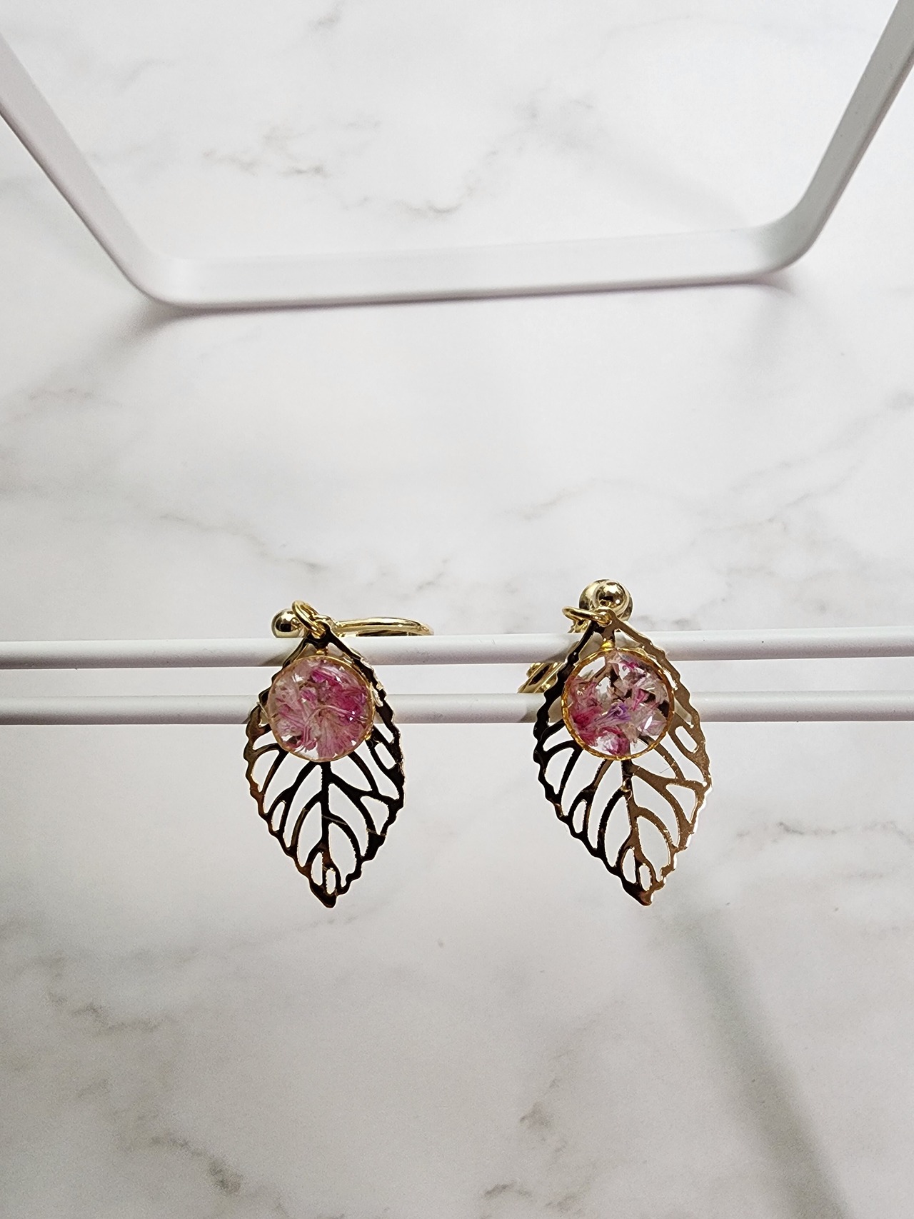 シンボル部分1.5×2.5。 小さなゴールドの葉っぱに、花びらを詰め込んだレジンを飾りました。