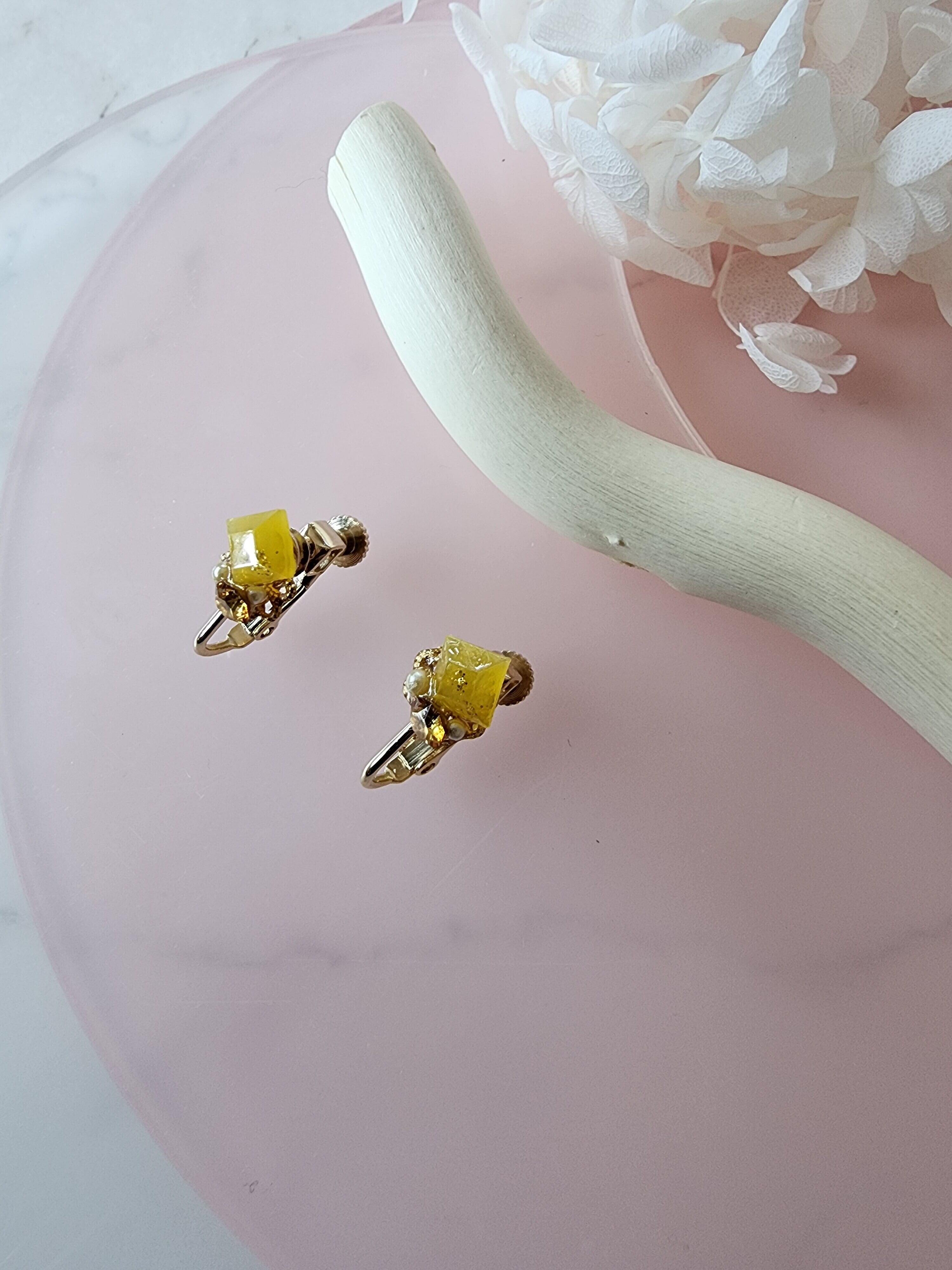 ゴールドの小さなお花に四角いレジンとビジューを飾った大人かわいいイヤリングです。 赤、青、黄、緑の四色ご用意しました。