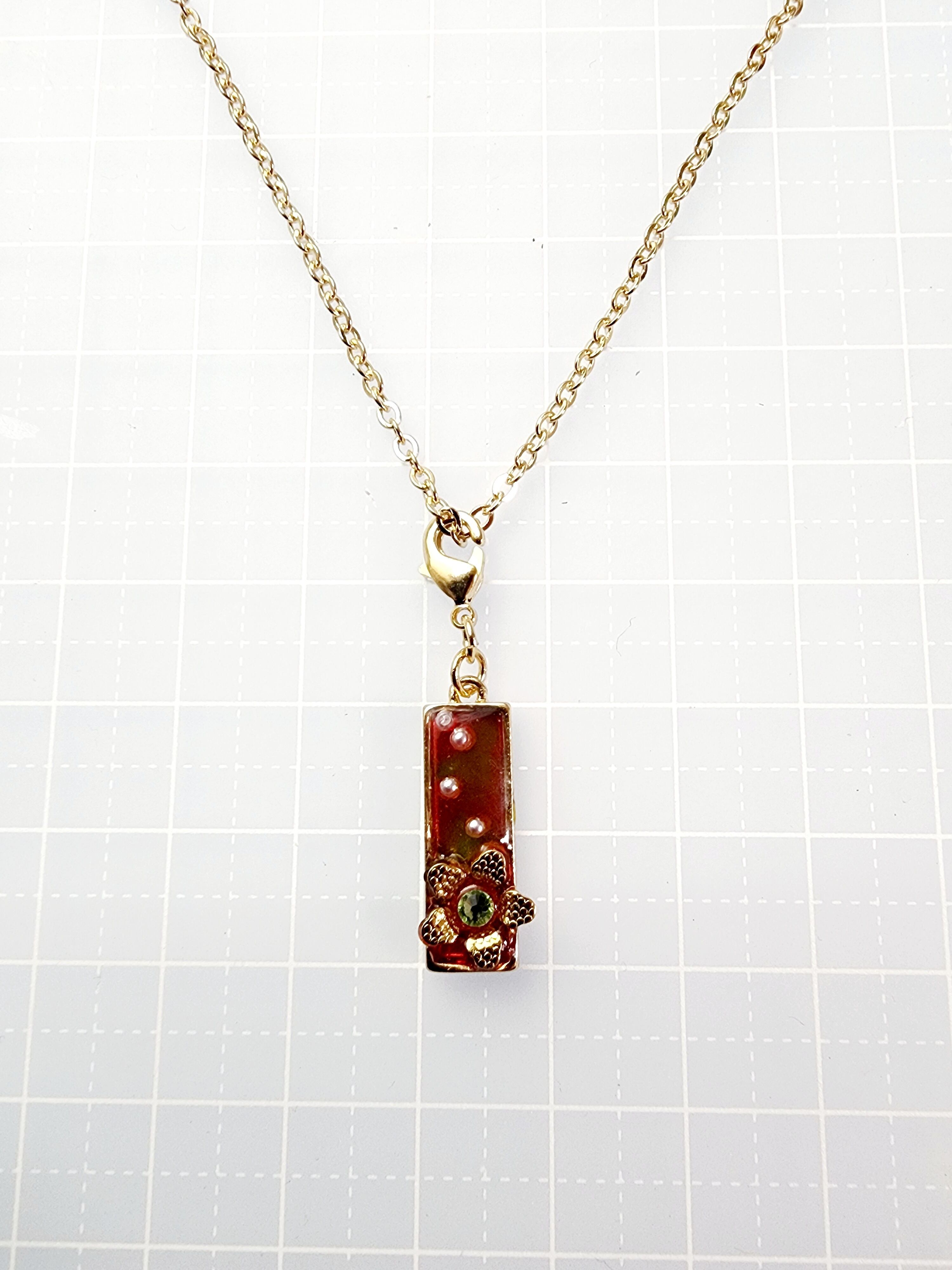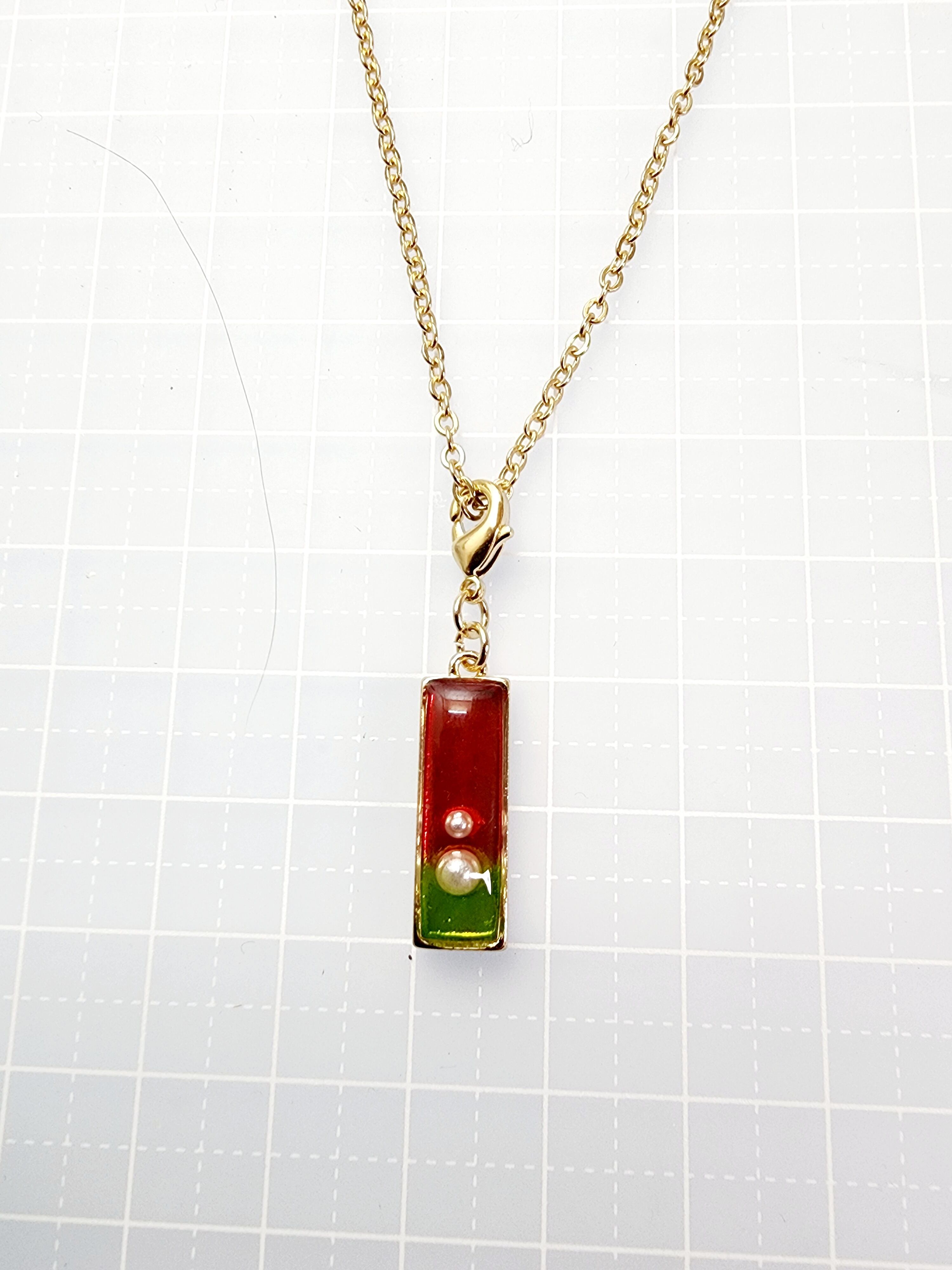 シンボル部分0.5×2㎝、 チェーン50cm、 ゴールドカラーの土台を、赤と緑のレジンで飾りました。 シンプルなパールと、お花を添えた品の2種をご用意しました。