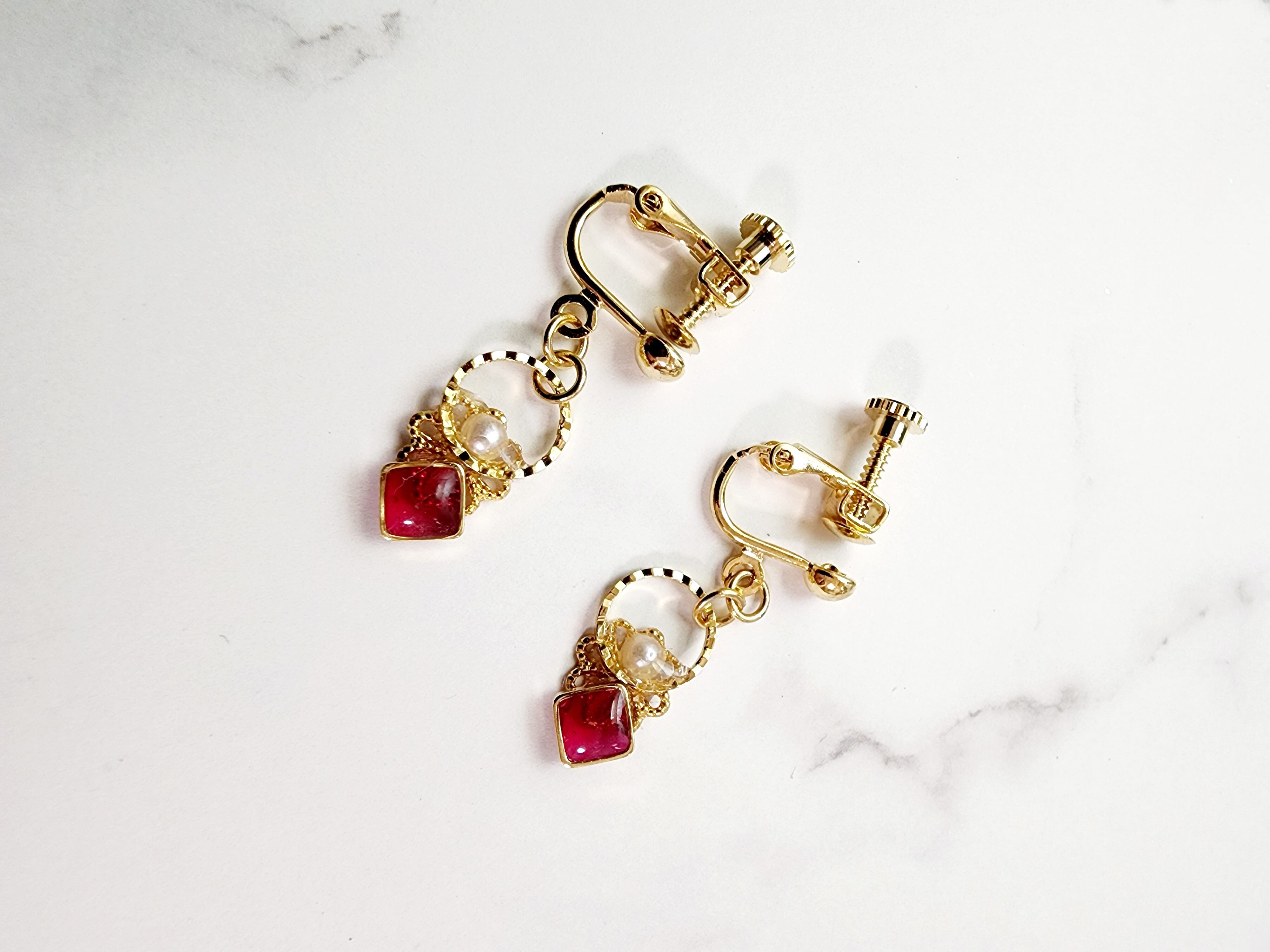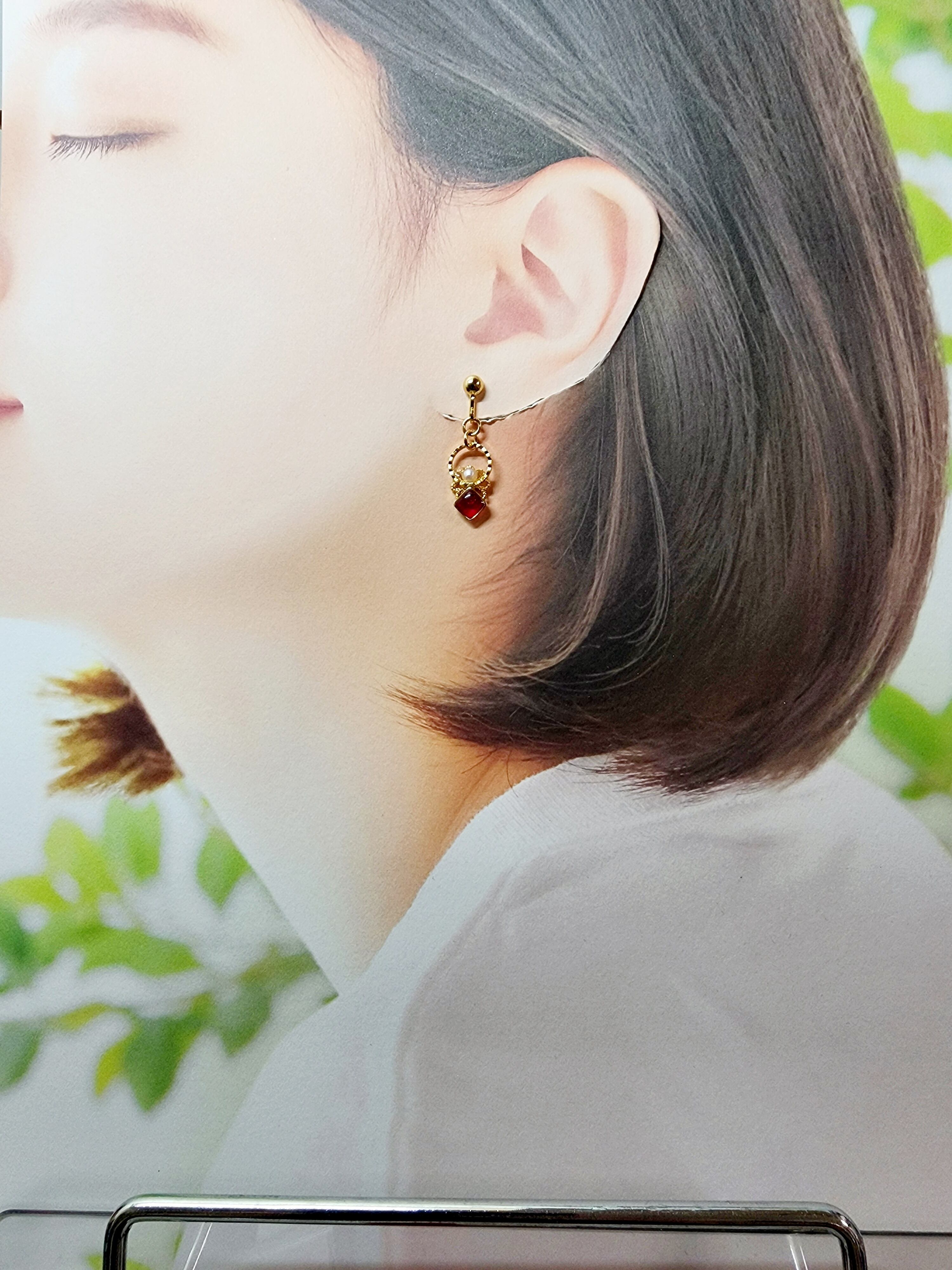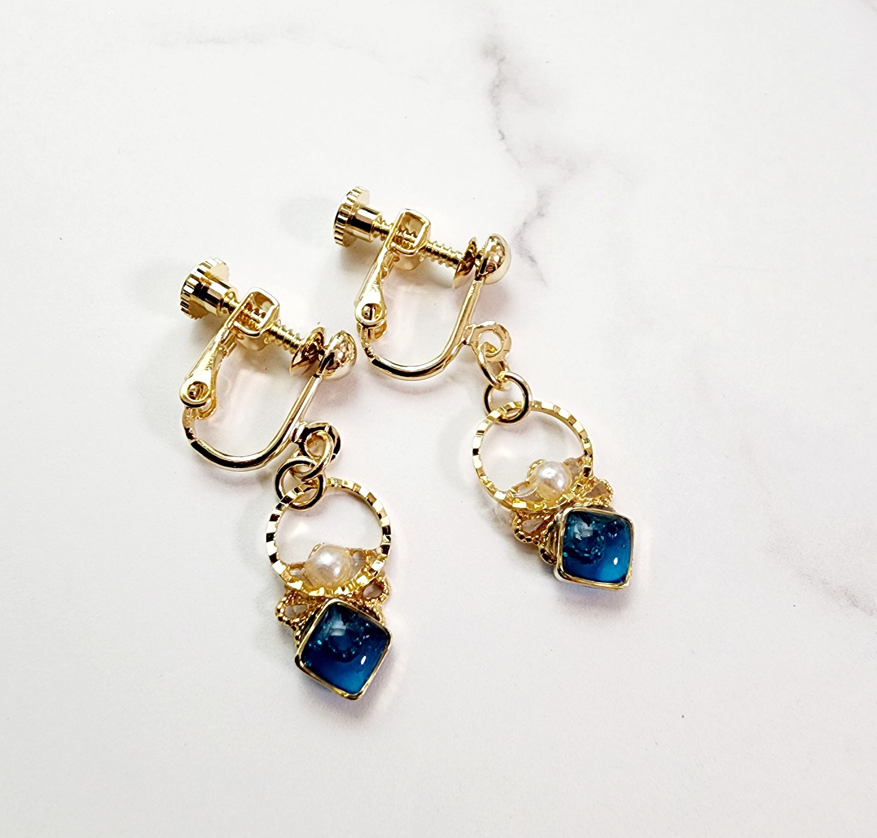 ゴールドの小さなお花にレジンのしかくとパールを飾りました。